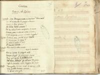 Autori, interpreti e trascrizione del testo alle c. 95-98. - Il testo manoscritto e le informazioni su autori e interpreti precedono, nel manoscritto, la partitura della stessa cantata; a c. 136v: "Fine del Terzetto e della Cantata 23: Gennaro 1794"; questa cantata è la sesta del volume il cui frontespizio e indice (Cantate ed arie di D. Giuseppe Sigismondo Dilettante. Libro I) è a carta 19r; questo corrisponde al manoscritto numero 833 della collezione di Giuseppe Sigismondo, acquisita dalla biblioteca alla sua morte; la cantata, secondo quanto scritto a carta 19r è "a 3 Due Soprani e Tenore per Fausto Ritorno di D. Gaetano Pegnalver in Napoli dall’assedio di Tolone nel 1794 Poesia di D. Mario pagano. Cantato dalle due sue figlie D. Marina, e D. Peppina, e D. Emmanuele Imbimbo con tutti Istrumenti"; nonostante faccia parte del manoscritto numero 833, sulla partitura vi è il numero 471, corrispondente alla cantata dedicata a San Gaetano; un’inesatta legatura del manoscritto ha comportato irregolarità nella struttura della cantata: le carte numerate 127-130 avrebbero dovuto essere posizionate tra le carte 134 e 135.